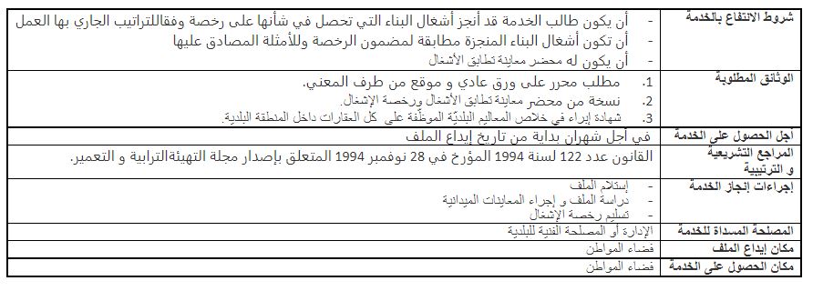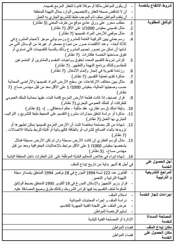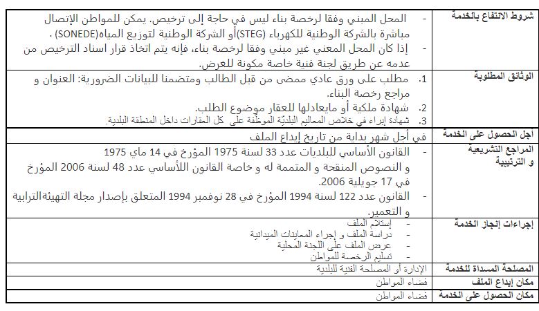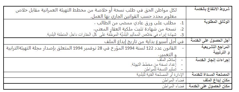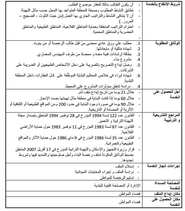 مصلحة الإعلامية ببلدية منزل جميل دليل الخدمات 24 كانون1/ديسمبر 2016 الزيارات: 150 الخدمات الإدارية العمرانية طباعة البريد الإلكتروني قرار مصادقة على تقسيم عقار قرار مصادقة على تجزئة عقار قرار تمديد رخصة بناء شهادة في صبغة عقار رخصة إشغال رخصة في تغيير صبغة عقار رخصة ربط بالشبكات العمومية الماء والكهرباء رخصة ربط بشبكة التطهير إعداد ملف تراخيص البناء طلب نسخة من مخطط التهيئة العمرانية التقاسيم محضر معاينة تطابق الأشغال