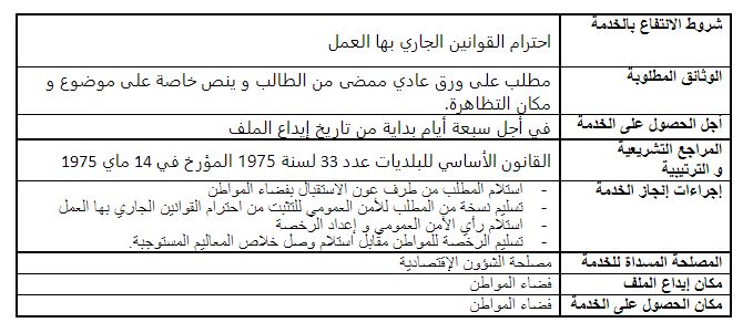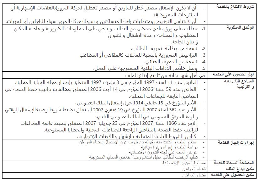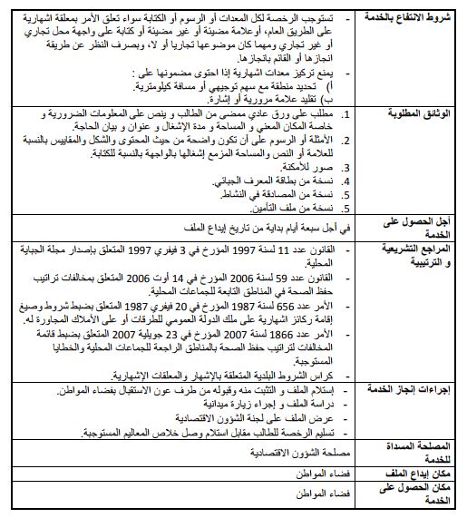مصلحة الإعلامية ببلدية منزل جميل دليل الخدمات 25 كانون1/ديسمبر 2016 الزيارات: 109 خدمات الشؤون الإقتصادية طباعة البريد الإلكتروني رخصة تركيز علامات إشهارية رخصة إشغال رخصة لتنظيم تظاهرة التراخيص الإقتصادية رخصة الإشغال الوقتي للملك العمومي